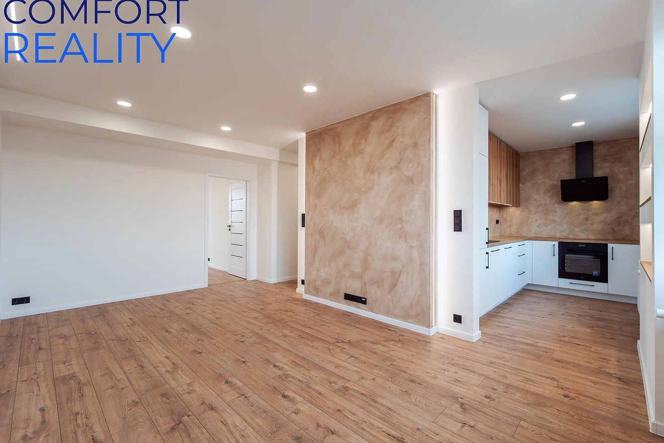 Interiér vás nadchne svou světlostí a moderním pojetím. Nová kuchyňská linka vyrobená na míru od stolaře, osazená kvalitními vestavnými spotřebiči. Celý prostor sjednocují zátěžové plovoucí podlahy a elegantní bílé interiérové dveře. Atmosféru dotvářejí vkusné sádrokartonové podhledy s bodovým osvětlením. Koupelna s moderními obklady disponuje prostorným sprchovým koutem a novou sanitou, přičemž v rámci rekonstrukce byly provedeny i kompletní rozvody elektřiny, vody a odpadů.