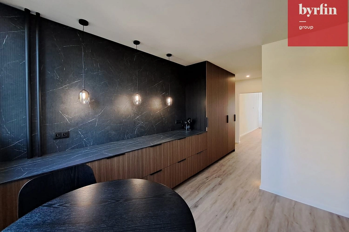 Interiér prošel v roce 2024 kompletní a nadstandardní rekonstrukcí – včetně nové elektřiny v mědi a nových rozvodů vody v plastu. Byt je laděný moderně a velmi vkusně, doplněný o nábytek na míru, který využívá prostor do posledního detailu.