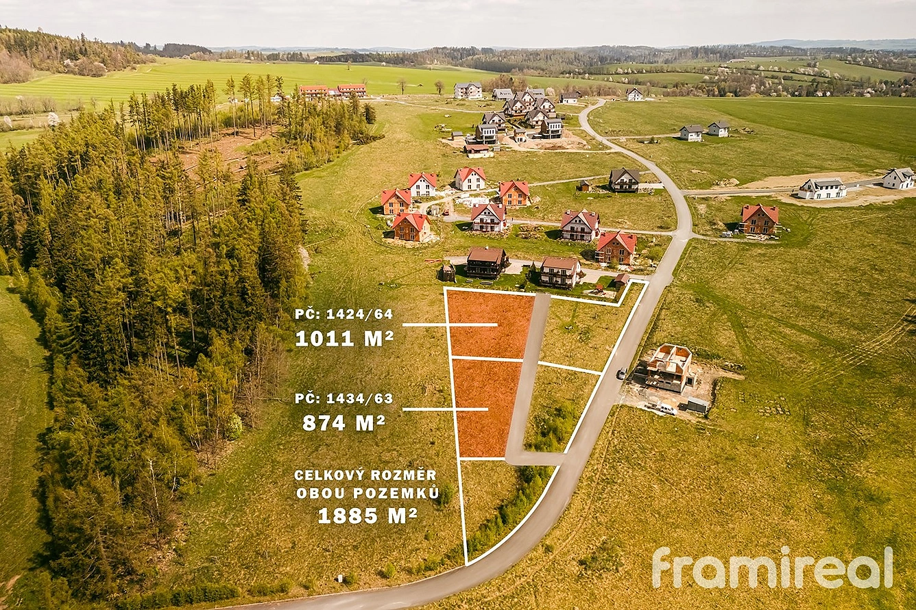 V prodeji máme 2 pozemky (parcela 1434/63 o výměře 874 m2 a parcela 1424/64 o výměře 1011 m2) + část pozemku 434/309 (cca 100 m2) pro napojení na komunikaci.