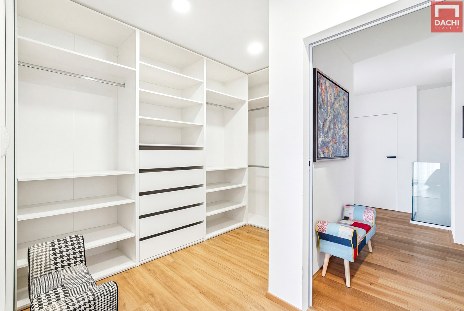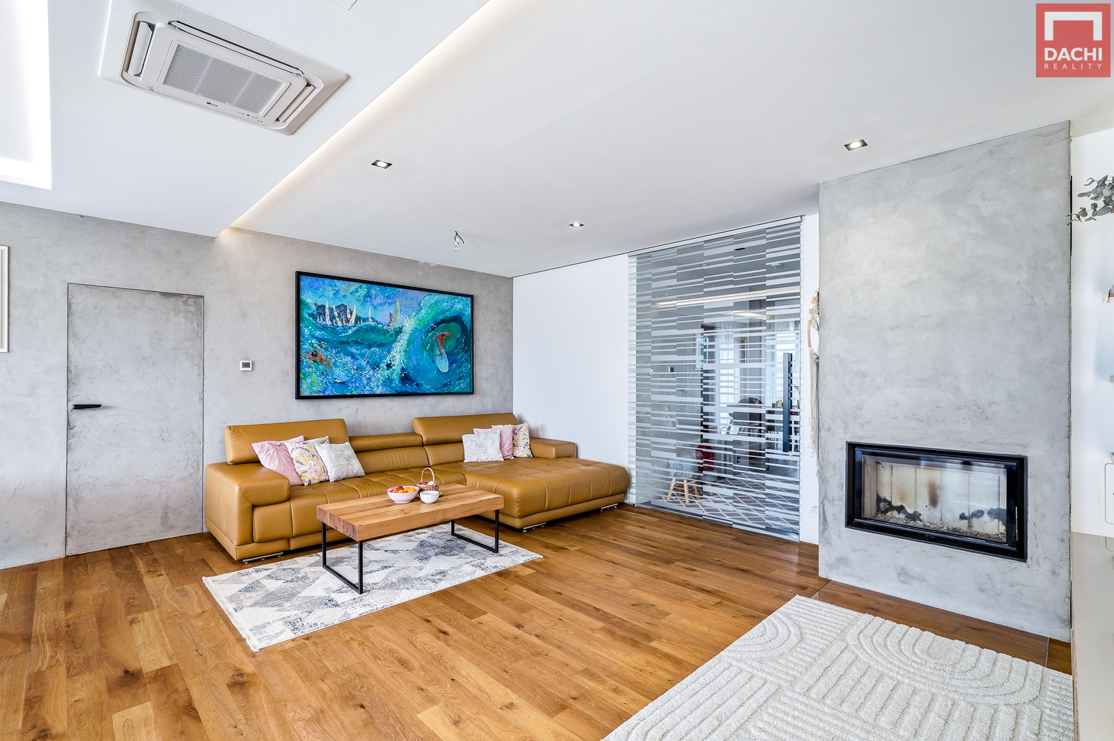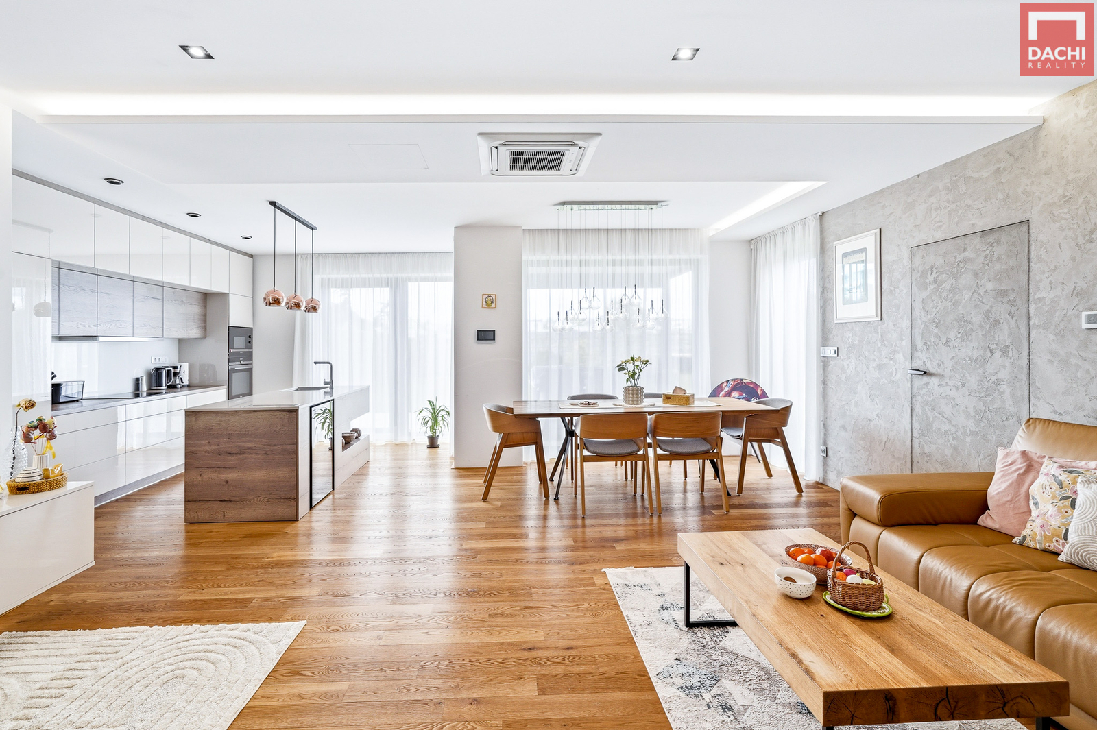 Kuchyň na míru je vybavena značkovými spotřebiči a dominuje jí velkorysý ostrůvek s vestavěnou vinotékou. Na kuchyň plynule navazuje prostorná potravinová spíž o velikosti 3,4 m². Obývací část pak příjemně dotváří krbová vložka.