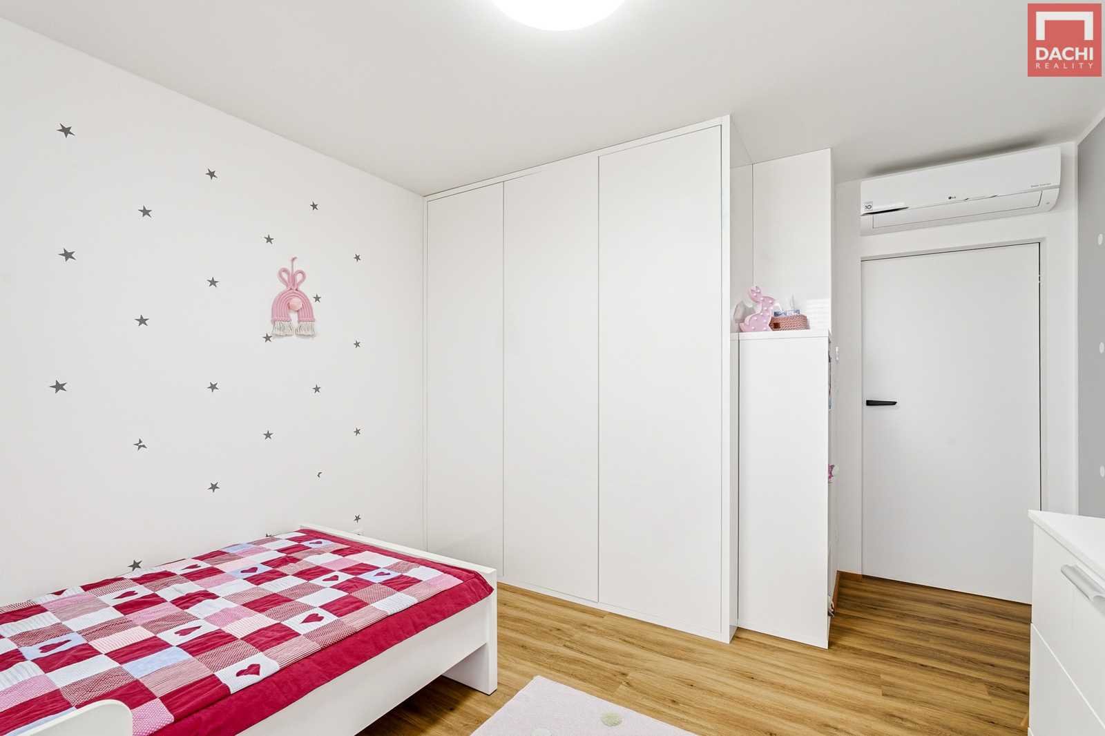 V patře je umístěna klidová zóna domu – ložnice se západní orientací, vlastní koupelnou se sprchovým koutem a toaletou a navazující prostornou šatnou. Dále zde najdete dva dětské pokoje orientované na východ, vybavené vestavěným nábytkem. Dále je zde další koupelna s vanou a toaletou, která je k dispozici těmto pokojům.