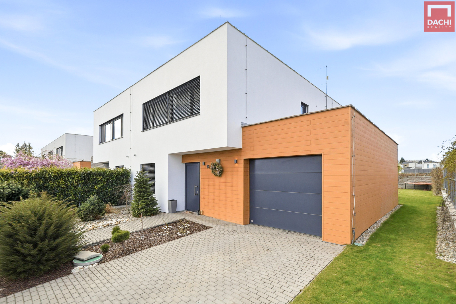 Dominantou domu je velkorysý obývací prostor propojený s kuchyní, který tvoří srdce celého domu. Díky západní orientaci je interiér krásně prosvětlený zejména v odpoledních hodinách a plynule navazuje na zahradu s vydlážděnou terasou. Ta je doplněna variabilní stínící pergolou a venkovními žaluziemi, které umožňují komfortní využití prostoru po celý den i rok. Zahrada je upravená tak, aby byla funkční a estetická – ideální pro odpočinek i rodinné aktivity.