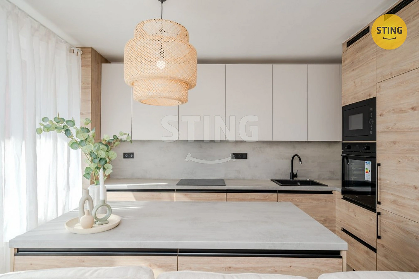 Interiér bytu je laděn do světlých přírodních tónů, které působí elegantně a útulně. Otevřený prostor kuchyně s obývacím pokojem vytváří příjemné centrum domova a velká okna zajišťují dostatek denního světla, díky čemuž byt působí prostorně a vzdušně.