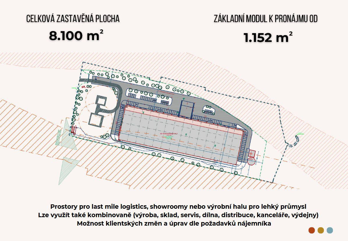 - celková zastavěná plocha budovou 8270 m², jednotky k pronájmu již od 1152 m²
